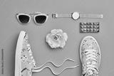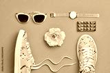 Fashion. Woman Accessories Set. Flat lay. Trendy Watch, Summer Sunglasses, Glamour fashion Pink Floral Sneakers. Flower. Stylish Spring Hipster Girl. Pastel Color