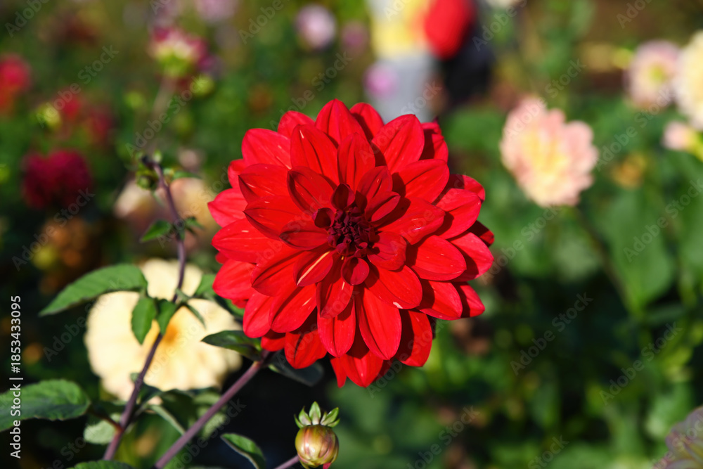 Close up of red decorative dahlia flower in full bloom with layered petals and rich color growing in garden natural light with soft background blur