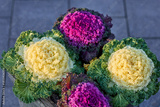Vibrant ornamental kale plants with bold purple and yellow hues