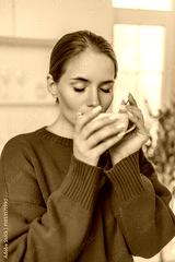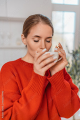 Woman coffee relaxation. Young woman in red sweater sipping hot morning beverage in kitchen.