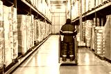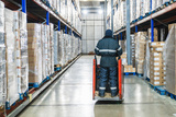 Worker in warm clothing moving pallets of goods with a forklift in a large low temperature cold storage facility