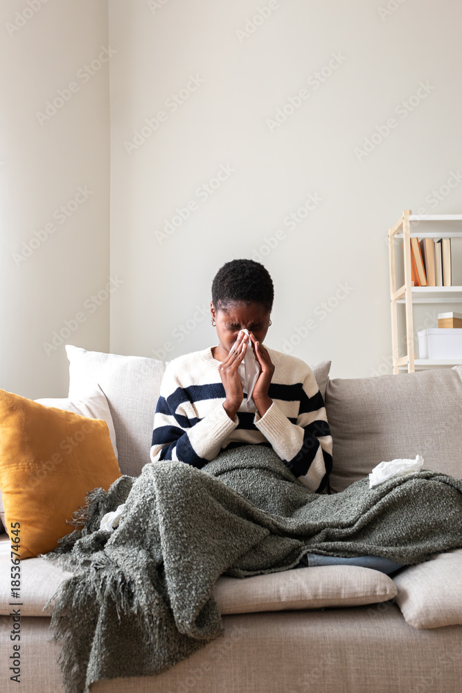 Woman blowing nose while resting on sofa at home