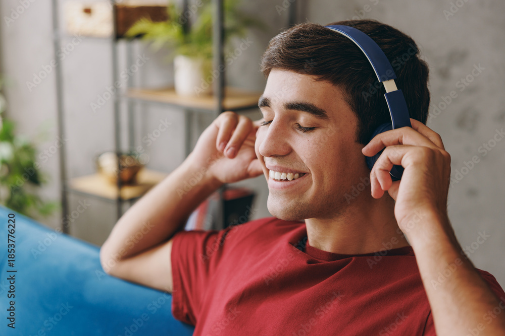 Close up calm young dreamful man wear red t-shirt headphones listen to music look aside sit on blue sofa stay at home flat rest relax spend free spare time in living room indoor People lounge concept