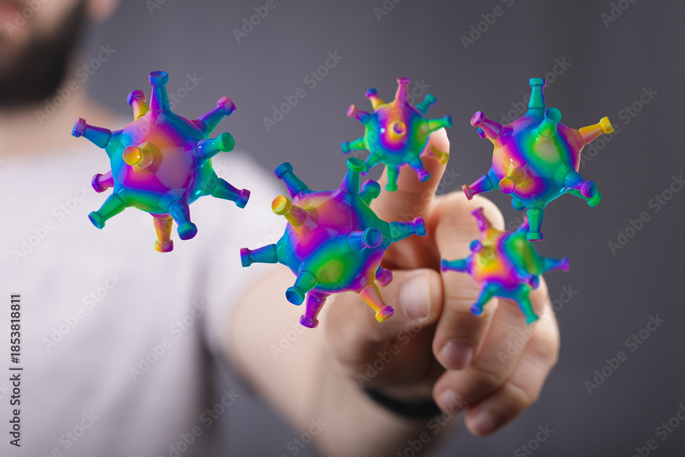3D rendered illustration of virus germs with a person hand, modern and abstract representation. Coronavirus ou