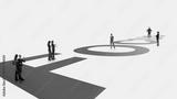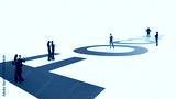Corporate artwork with team standing on word FOCUS. Concept of concentration and priority management visuals, productivity frameworks, team alignment materials, performance strategy presentations.