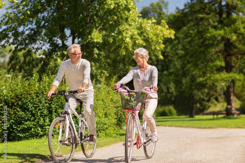 happy senior couple riding bicycles at summer park