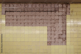A close-up view of an old interior wall featuring yellow square ceramic tiles. A large section of the tiles is missing or has been removed for renovation, revealing the gray textured grid of the dried
