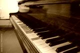 A side-angle close-up view of an antique acoustic piano keyboard. The instrument shows signs of age and wear, with several white keys missing their ivory coverings, revealing the raw wood texture.