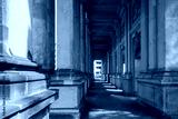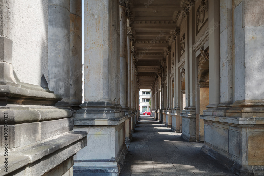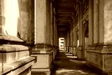 Outdoor perspective looking down a long corridor lined with massive stone columns. Bright sunlight casts rhythmic shadows across the paved floor leading the eye toward green trees in the distance.