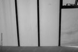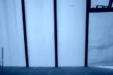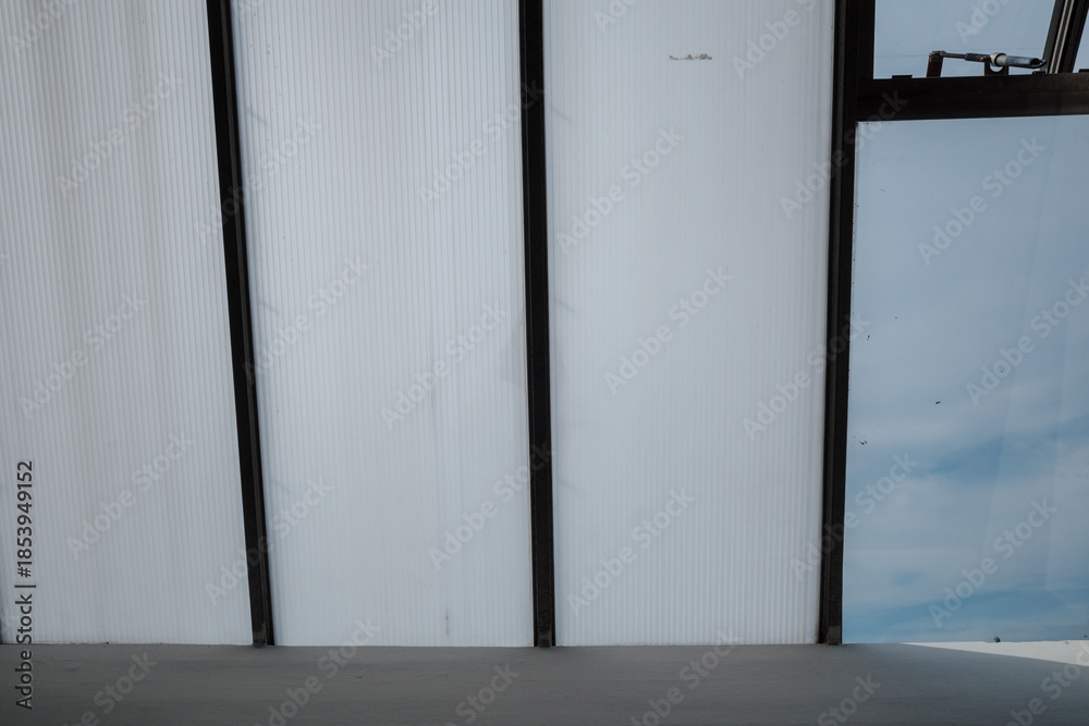 A low angle view looking up at a ceiling structure made of vertical translucent white corrugated plastic panels separated by dark beams.