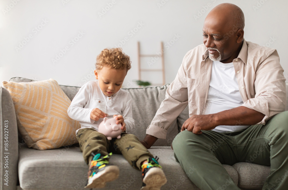 Happy African American Grandfather And His Grandson Putting Coin Money In Piggybank Sitting On Sofa At Home. Personal Savings, Bank Safety And Financial Investments Concept