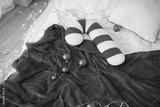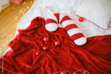 Cozy red blanket with candy cane pillow and ornaments on bed with festive lights