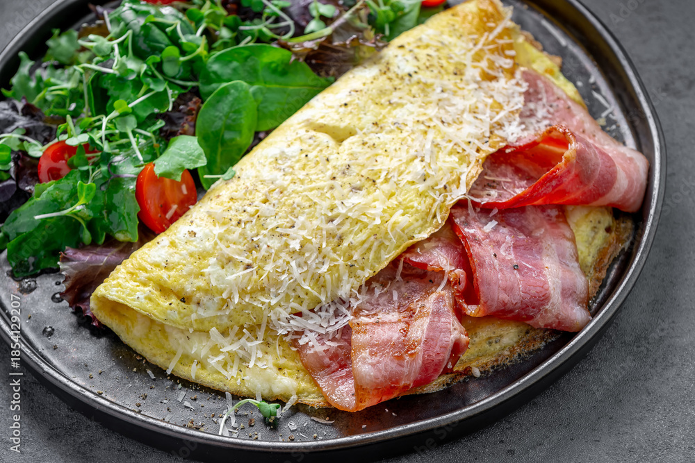 Omelet with bacon and salad close up. Close-up shot of an omelet with bacon and salad, sprinkled with grated cheese.