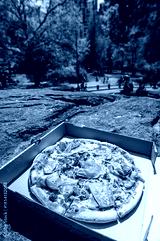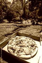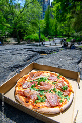 Pizza picnic with city park view and fresh Italian toppings. Box of Italian pizza with prosciutto and arugula placed on a rock with city park and people in background.