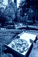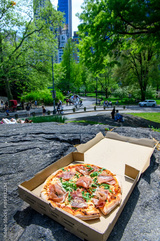 Pizza picnic in park with skyline view on sunny day. Box of Italian pizza with prosciutto and arugula set on a rock in city park with people walking and relaxing nearby.