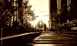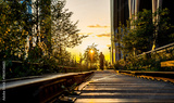 New York, USA, 8 August 2025: Cyclist at golden hour. Cyclist riding through golden hour light along the rails of Manhattan’s High Line.
