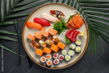 Large Sushi and Sashimi Platter with Edamame and Crab. An extensive platter displays a full selection of sushi, sashimi, and maki rolls, including crab and edamame, surrounding seaweed.