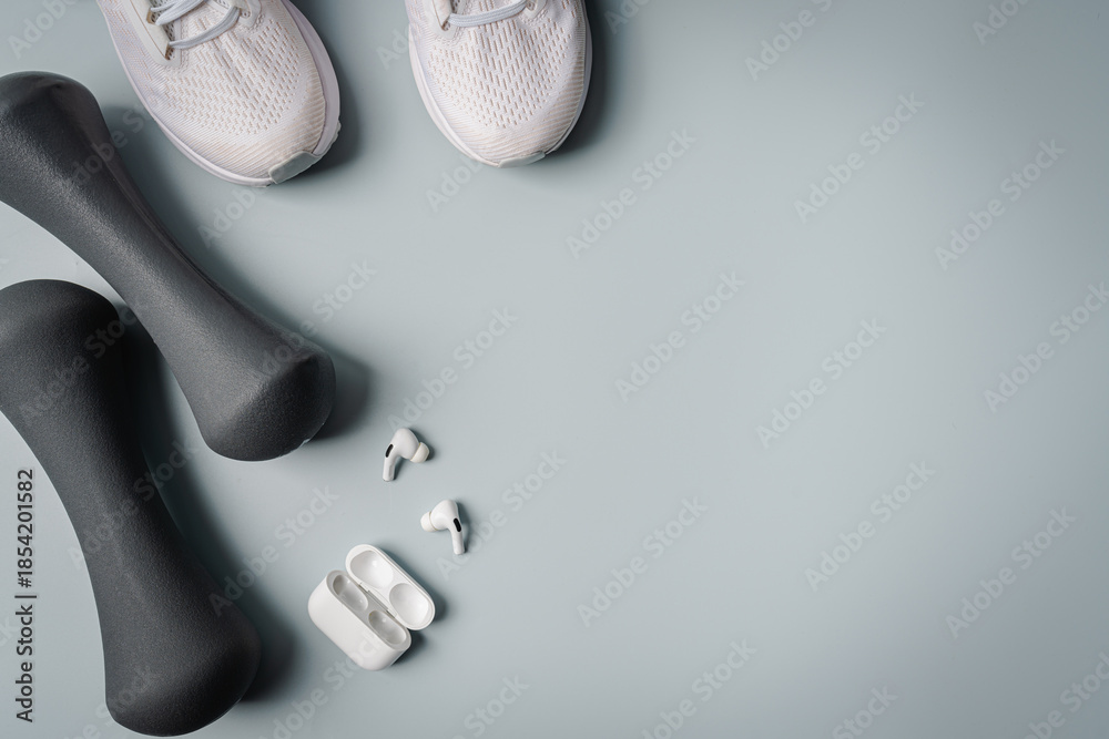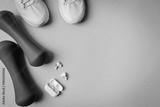 Bodybuilding sport concept. Top view photo of dumbbells and white sneakers on gray background