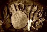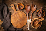 Old wooden kitchen utensils or cooking tools and bowls on wooden background, top view, flat lay. Kitchenware collection with copy space. Cooking background.