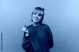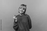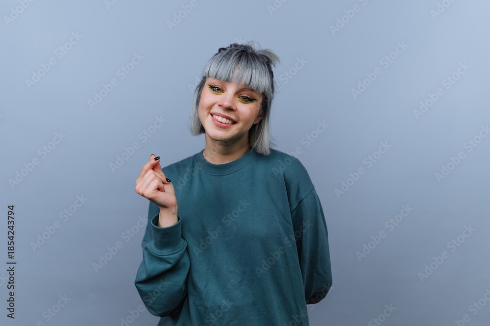 Young woman smiles and poses with a hand gesture in a studio with a plain gray background during bright indoor lighting