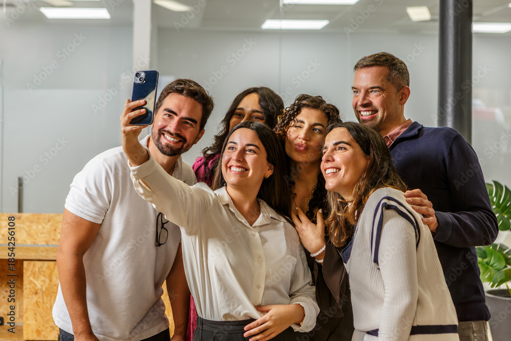 Group of people taking a selfie in a modern coworking space