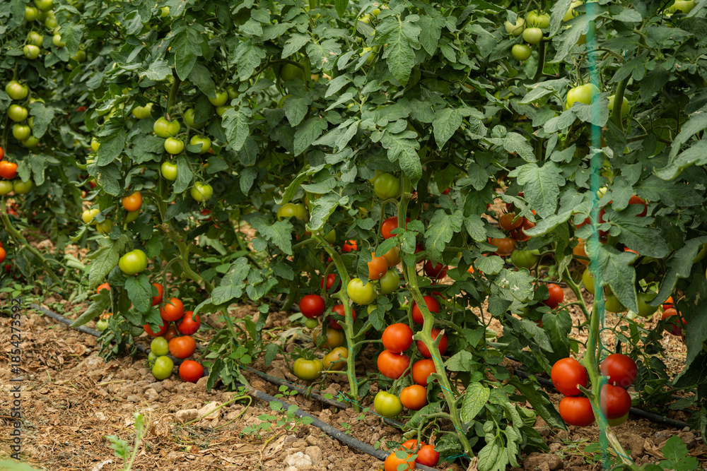 Tomato plants growing in a professional greenhouse, showing clusters of red and green vine tomatoes on the vine with drip irrigation system on the ground