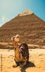 Relaxed Camel Under The Sun In Front Of A Pyramid