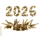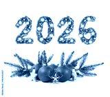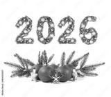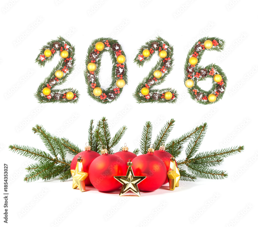 Christmas New Year 2026 Number Made with Evergreen Branches and Holiday Decoration with Red Bauble on a white background