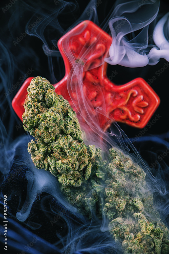 Detail of dried cannabis nugs (God bud marijuana strain) isolated over black background