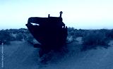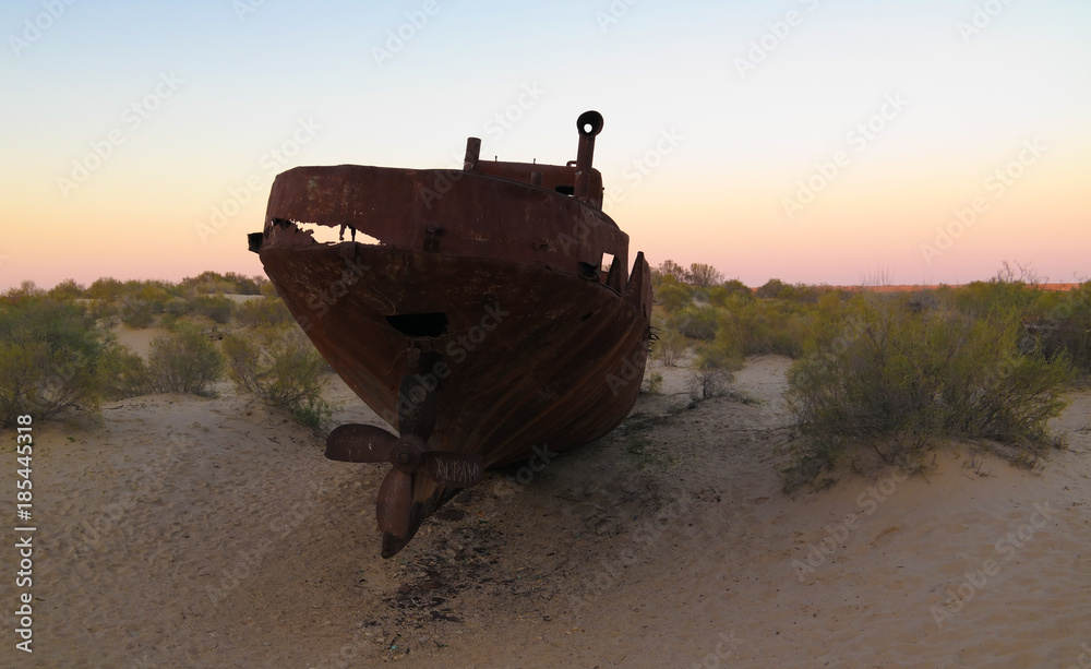 Panorama of ship cemetery at sunset near Moynaq, Karakalpakstan, Uzbekistan