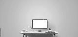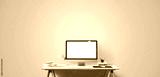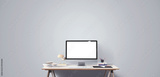 Computer display and office tools on desk.