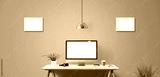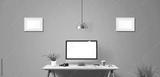 Computer display and office tools on desk.