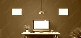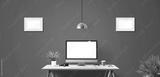 Computer display and office tools on desk.