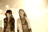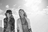 Friends, women and happy in desert for sandboarding, holiday adventure and getaway trip with space. Sunglasses, travel or girls with board sport outdoor for dune activity, summer vacation and bonding