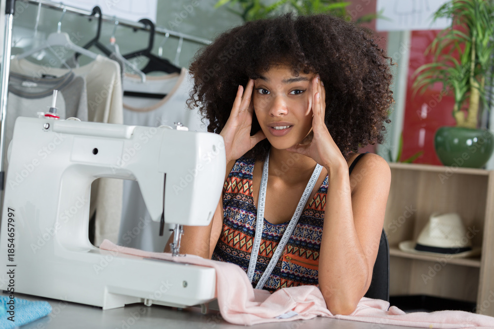 young seamstress woman having difficulties with sewing machine settings