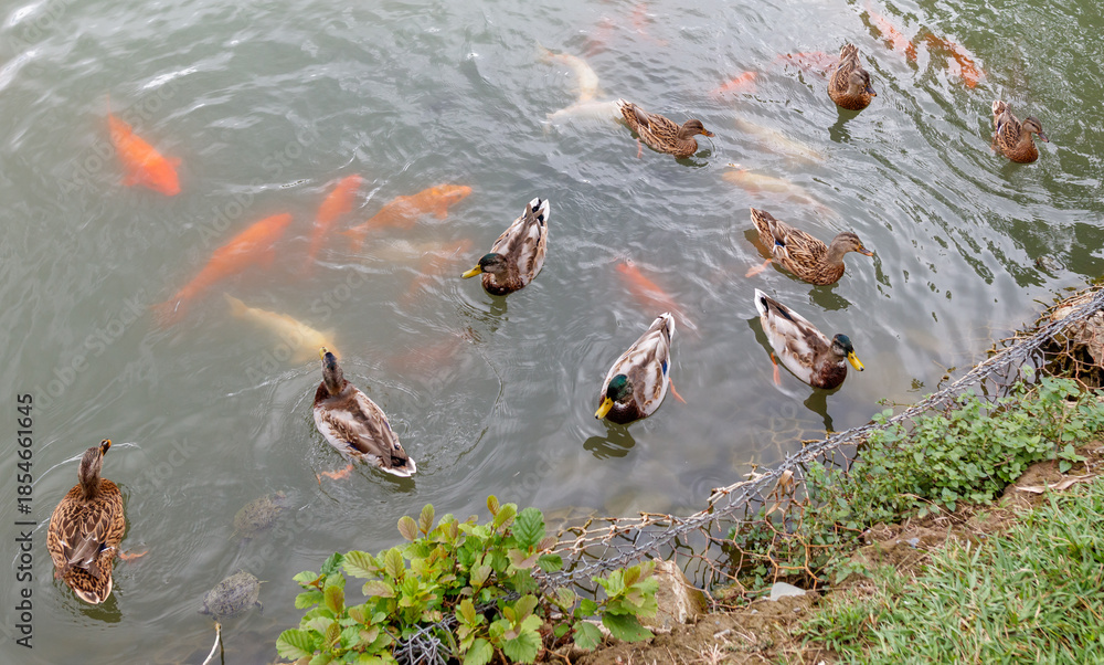 A group of ducks swimming in a pond with fish