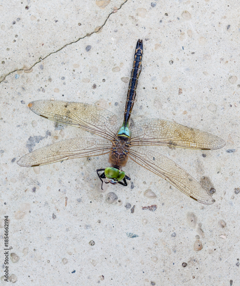A dragonfly is laying on the ground