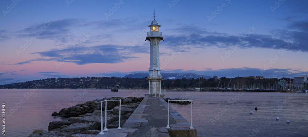 Paquis lighthouse at Lake Geneva, Switzerland, at dusk.