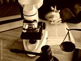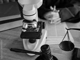Microscope and gavel on desk in legal setting with papers and scales of justice
