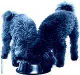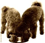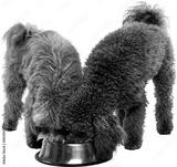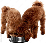Two poodle dogs eating from metal bowl on transparent background with natural brown fur. Concept of pet food advertising, nutrition branding, product promotion, ecommerce marketing, commercial visuals