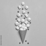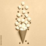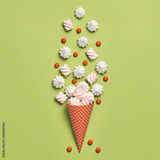Ice Cream Cone with Candies Sweets. Marshmallow, Meringue background. Flat lay. Summer Party, Birthday Firework. Vanilla Pastel Color. Trendy fashion Style. Minimal. Art