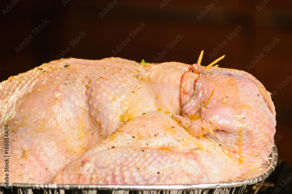 Turkey basted with butter, salt and pepper, ready to be put into the oven.