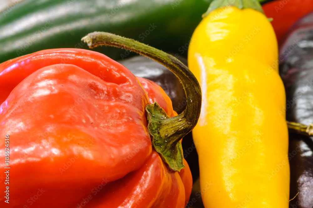 A selection of hot chili peppers (scotch bonnet, jalapeno, fresno, dutch)