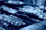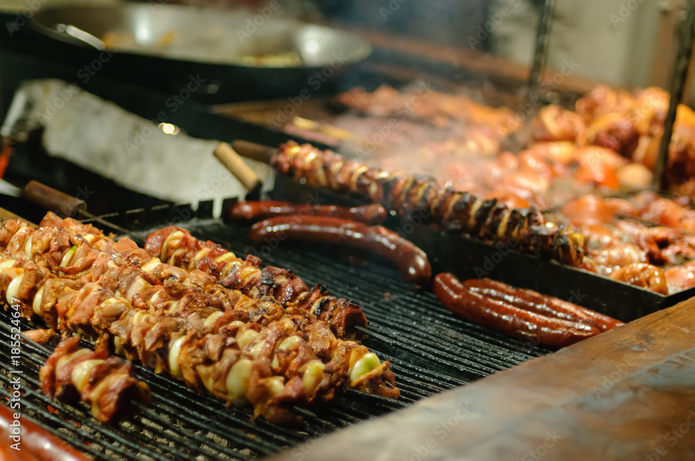 Sausages, skewered kebabs and ham knuckles on sale at the Christmas Market, Krakow