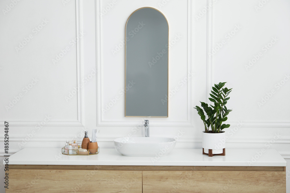 Stylish mirror, vessel sink and houseplant in bathroom. Interior design