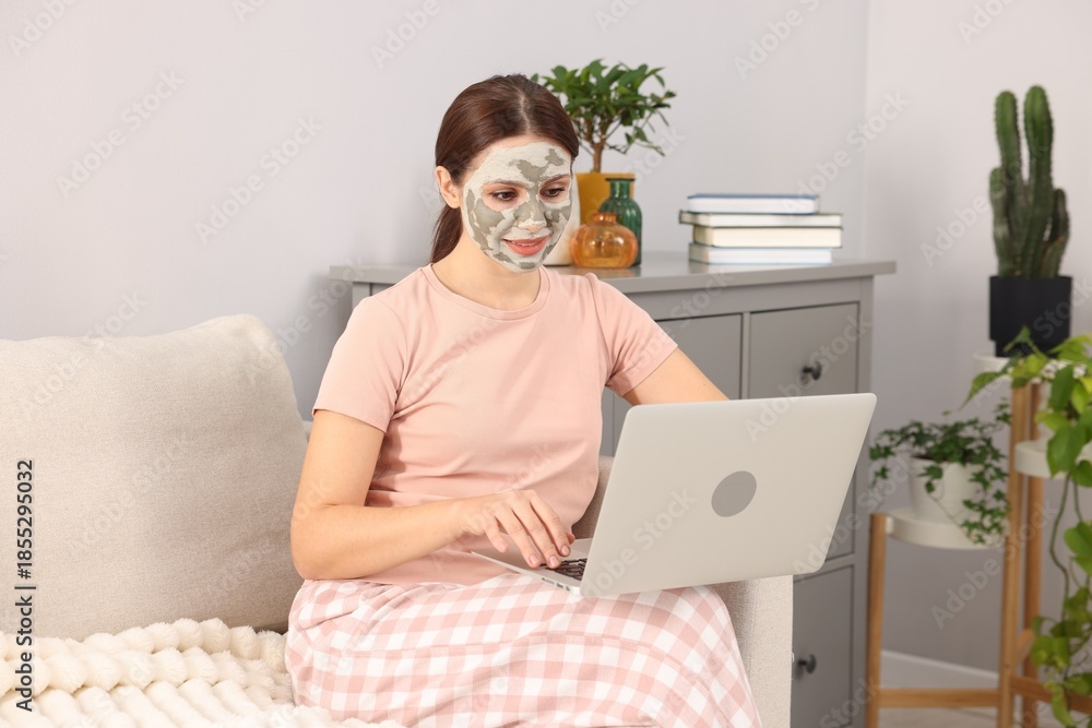 Woman with clay mask on her face using laptop at home