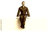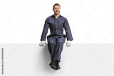 Smiling male worker in a uniform and gloves sitting on a blank panel