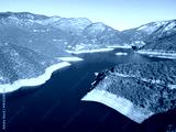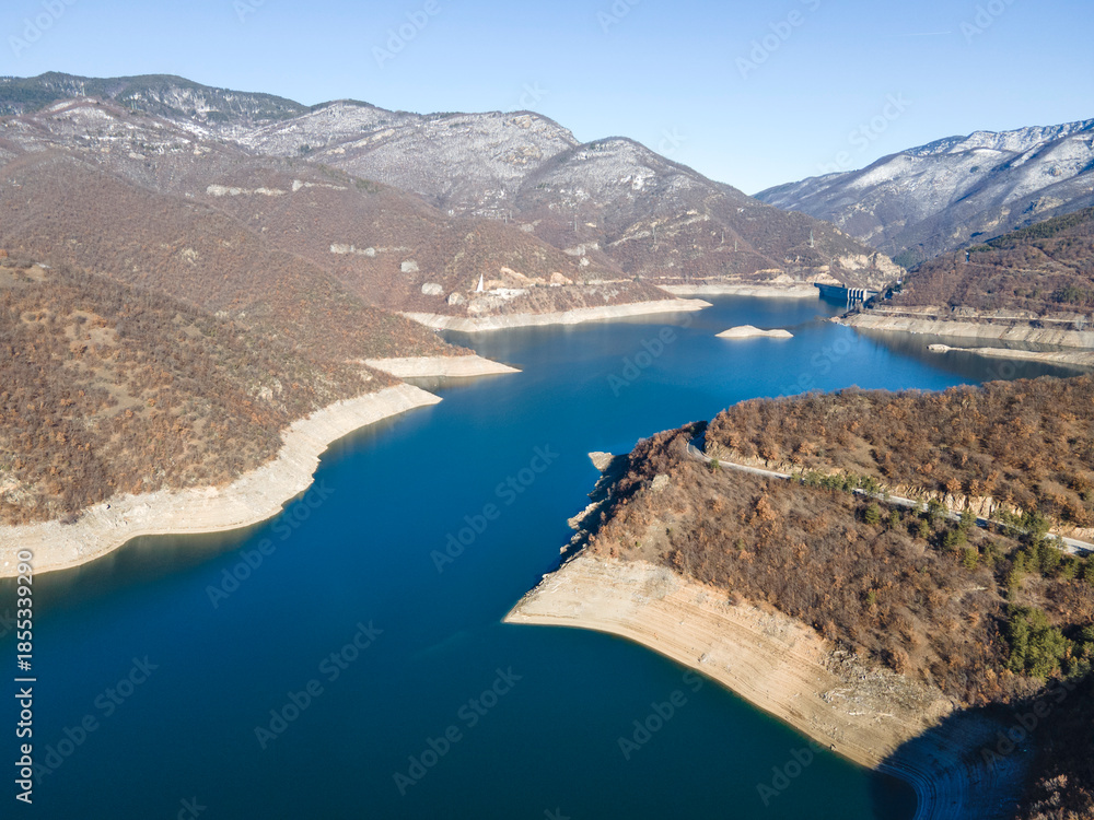 Aerial winter view of Vacha (Antonivanovtsi) Reservoir, Bulgaria