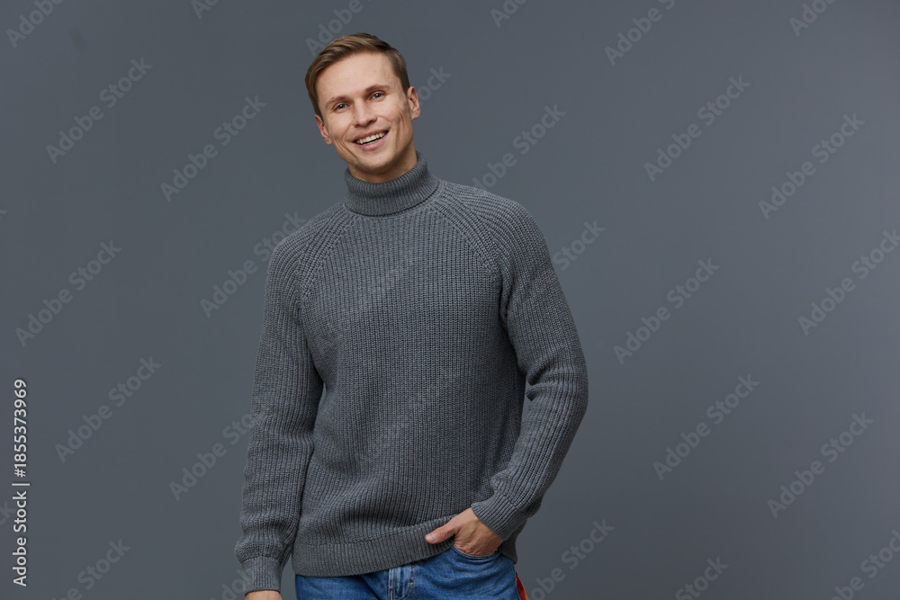 Smiling man in casual gray sweater standing against plain gray background, looking at camera with friendly expression, relaxed posture, modern fashion style, studio portrait, people lifestyle concept.