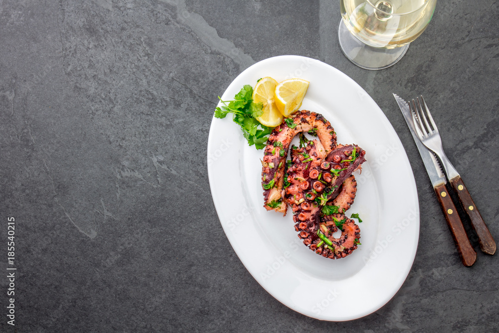 Grilled octopus on white plate serverd with white wine , top view. Seafood
